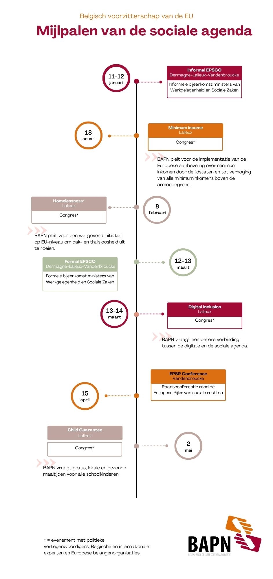 BAPN verwelkomt dat het een actieve rol heeft kunnen spelen in het vormgeven van het sociaal programma van het Belgisch Voorzitterschap van de Europese Unie. Dankzij dit programma wil België een ambitieus actieplan opstellen voor de Europese instellingen die na de Europese verkiezingen van juni 2024 zullen worden opgericht. Dit actieplan moet zorgen voor een daadkrachtige uitvoering van de sociale agenda van de EU, de zogenaamde Europese Pijler van Sociale Rechten, en het bereiken van de Europese doelstelling om 15 miljoen mensen uit de armoede te halen tegen 2030.