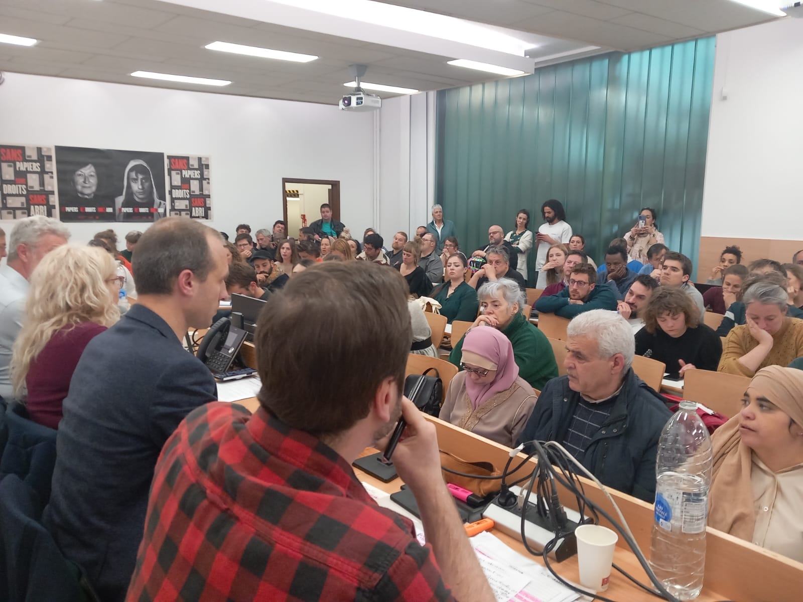 - dans une salle bondée comprenant à la fois des personnes en situation précaire et des travailleurs sociaux du secteur